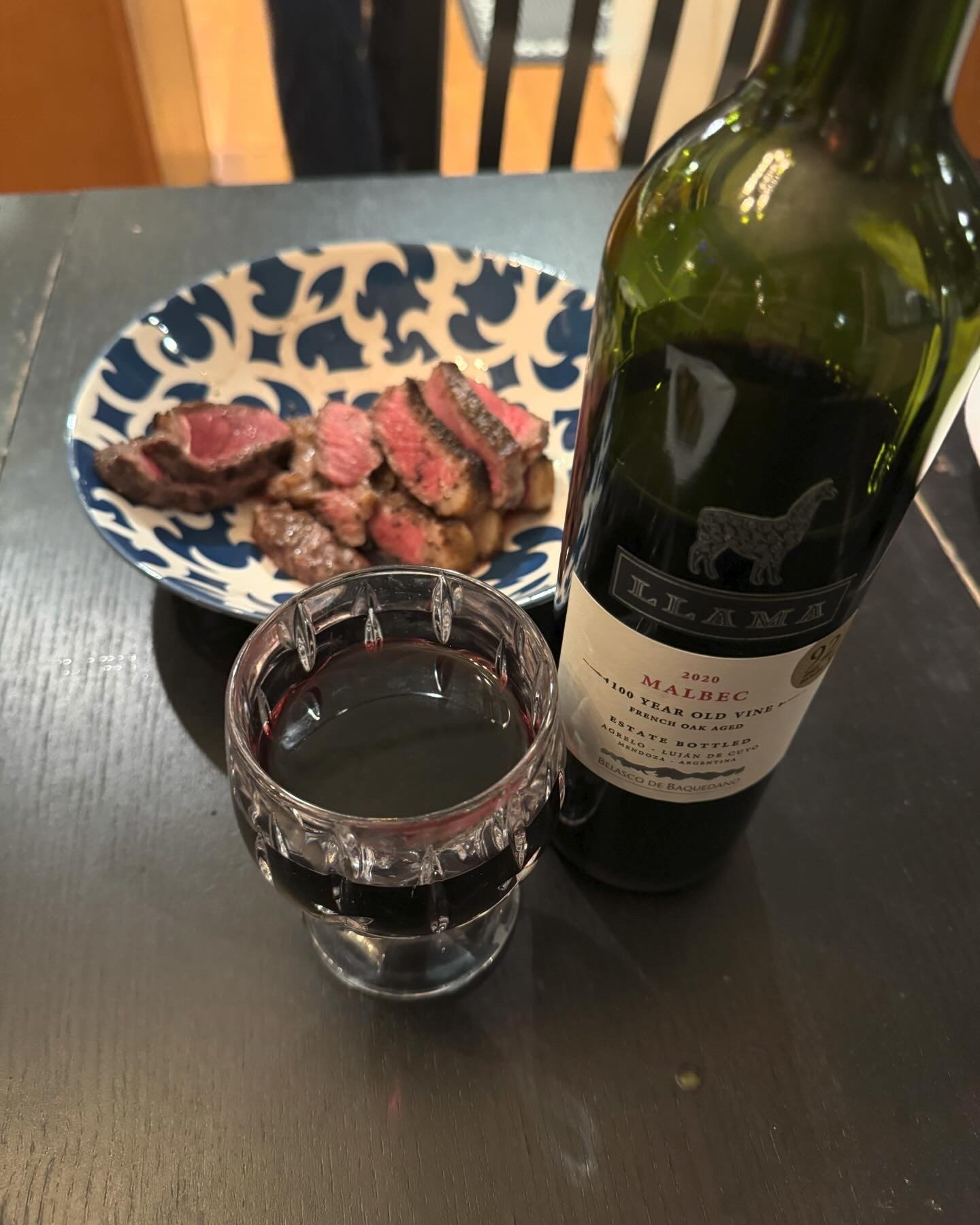Steak (made by a friend) with Llama 2020 Malbec, Lujan de Cujo, Mendoza, Argentina.
