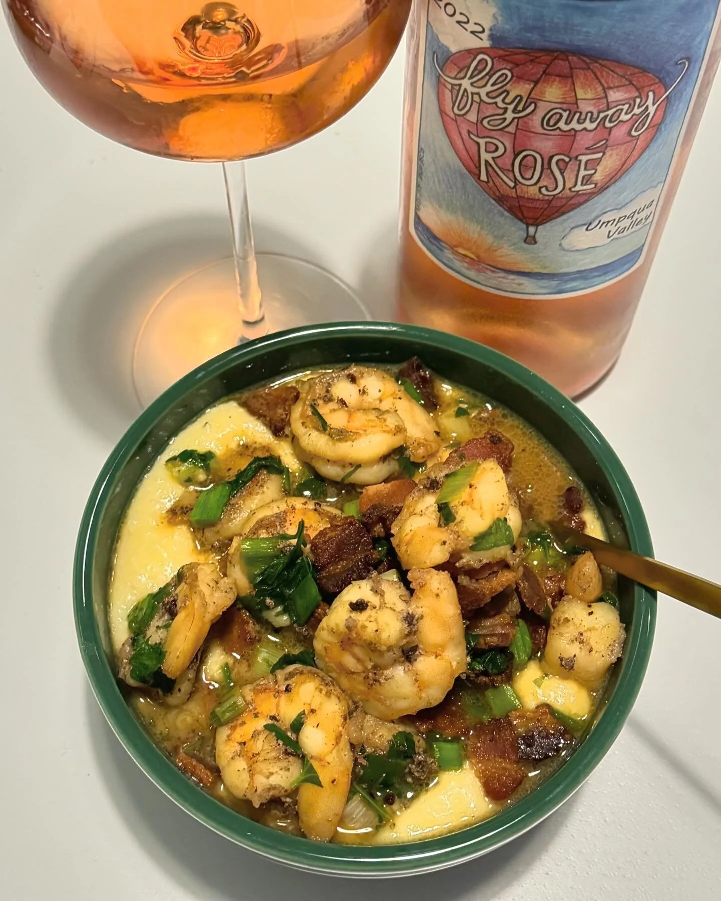 Shrimp and grits (made by moi) with Girardet Vineyards 2022 Fly Away Rosé.